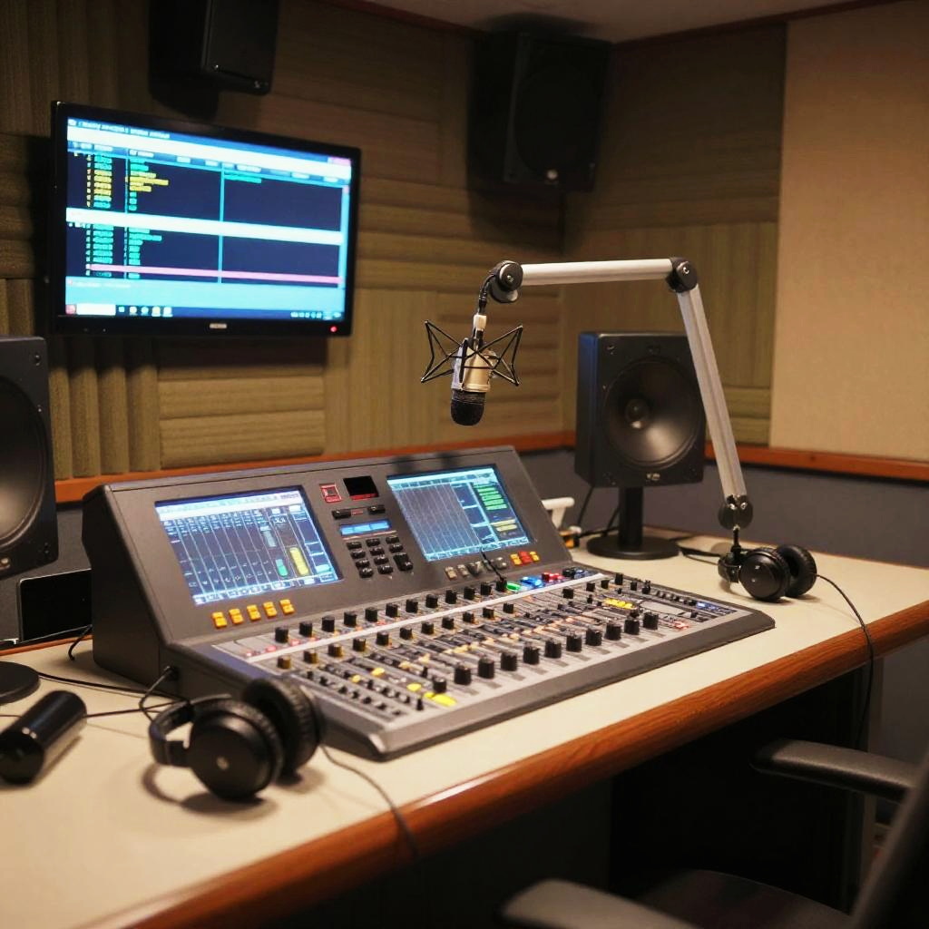Radio station interior with modern equipment and soundproof walls, glowing LED control panels, a cozy DJ booth with microphones, headphones, and mixing consoles, illuminated by warm ambient lighting, showcasing a high-tech yet inviting atmosphere.