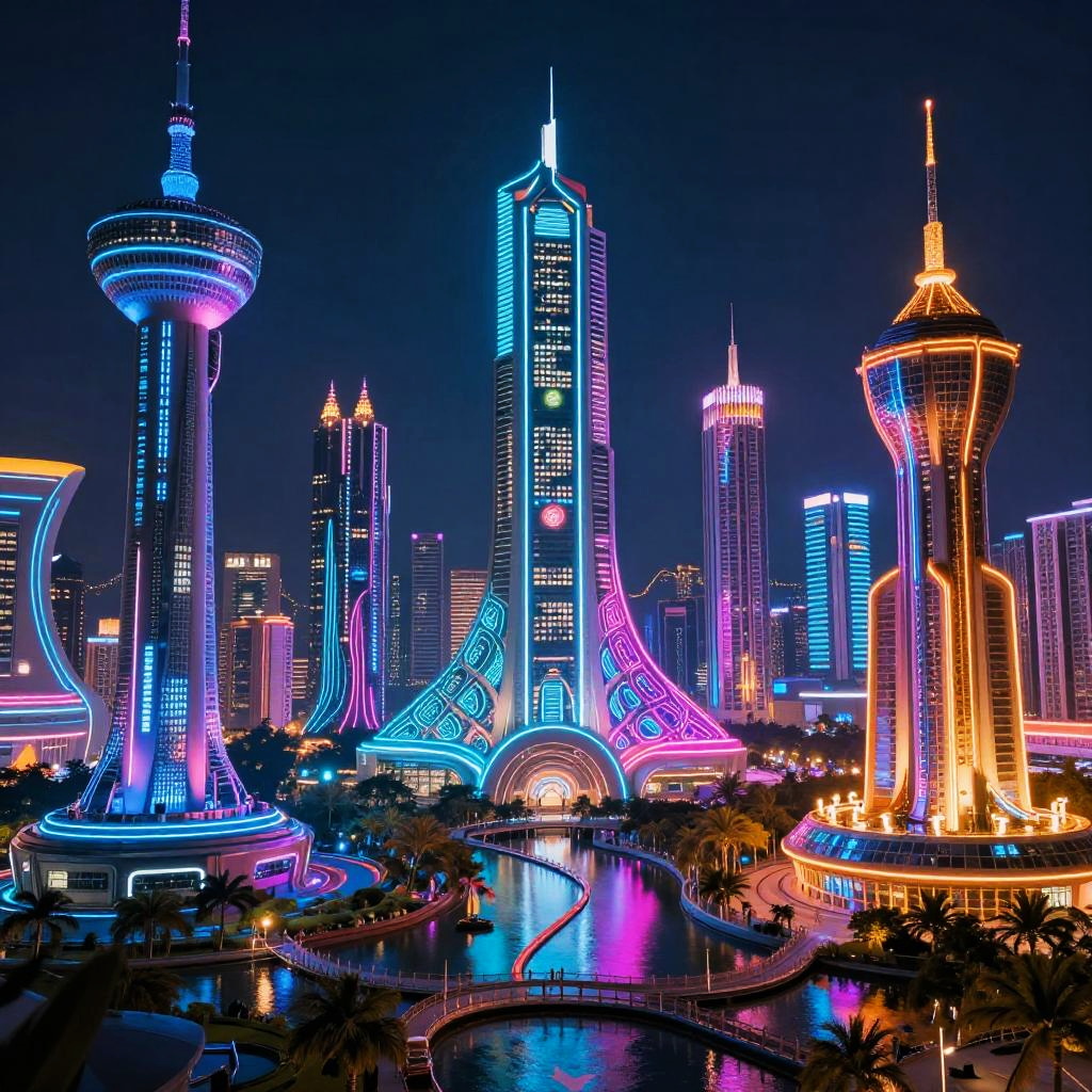 AI photo prompts featuring futuristic technology landscapes, vivid neon colors, intricate digital patterns blending with natural elements, hyper-realistic style, dynamic composition, high contrast lighting creating a sense of innovation and creativity.