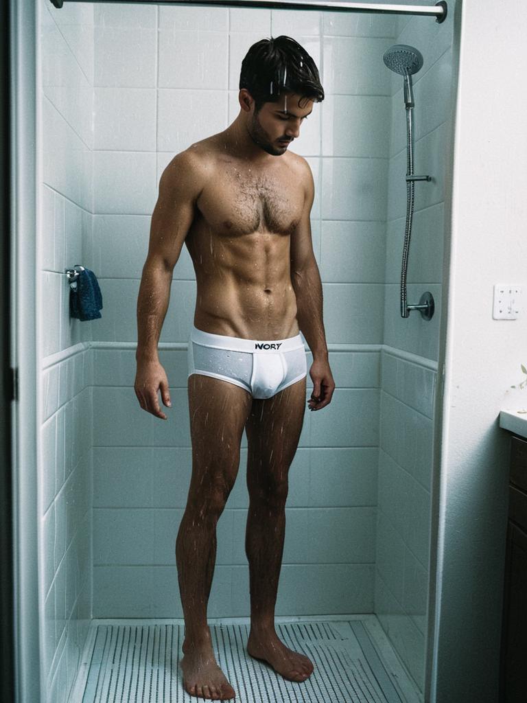 Man Standing in Shower Wearing White Underwear