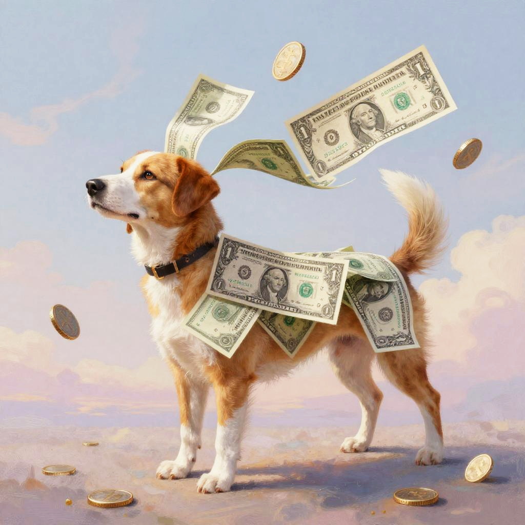 1 dollar dog in a surreal art style, dog composed of dollar notes flowing like fabric, dreamy pastel sky, floating coins around, delicate brush strokes, imaginative and elegant composition
