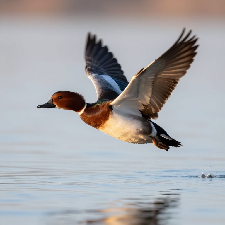 Crowned duck in mid-flight over a serene lake at dawn, wings spread wide revealing iridescent feathers and a sparkling crown, dynamic motion with cinematic lighting