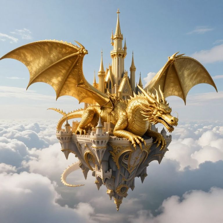 Suspended between dream and reality, a majestic castle perches atop the ethereal form of a slumbering dragon, its spires piercing the heavens like whispers of eternity, while the soft hum of the clouds below echoes the quiet pulse of a world where myth and wonder intertwine.
