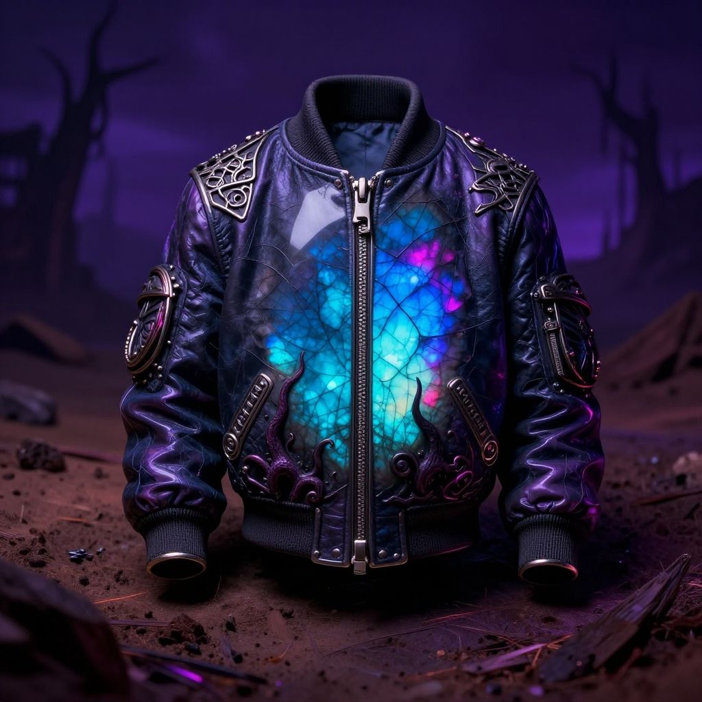 Photograph of a black, glossy leather bomber jacket with intricate silver embroidery on the shoulders and sleeves. The jacket's central zipper is illuminated with vibrant blue and purple neon lights, creating a glowing effect. The background is a dark, moody forest with silhouetted, leafless trees and a reddish-brown, textured ground. The jacket is centered and slightly forward, with its front facing the viewer, highlighting the neon glow against the dark surroundings. The image has a cyberpunk aesthetic with a high-contrast, dramatic lighting style.