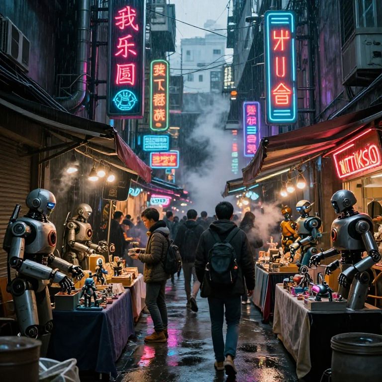 Tittoks, retro-futuristic robot market bustling with diverse android vendors, neon signage in an alien language, crowded narrow streets with steam and rain, cyberpunk style with strong contrasts and rich neon color palette