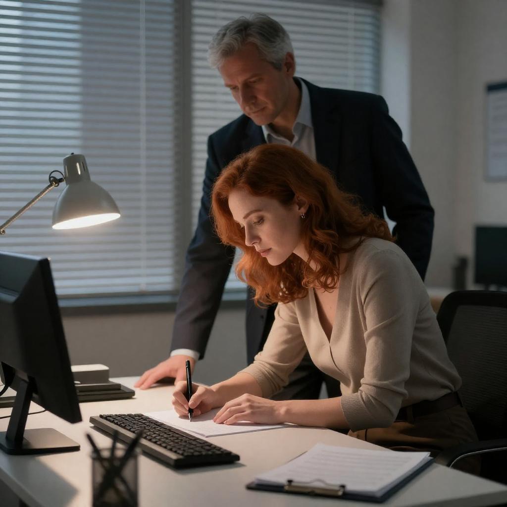 Photograph of an office at night. A woman with red hair, wearing a beige top, leans over a desk, writing. A man with gray hair, in a dark suit, stands behind her. Lamp on desk, blinds in background.