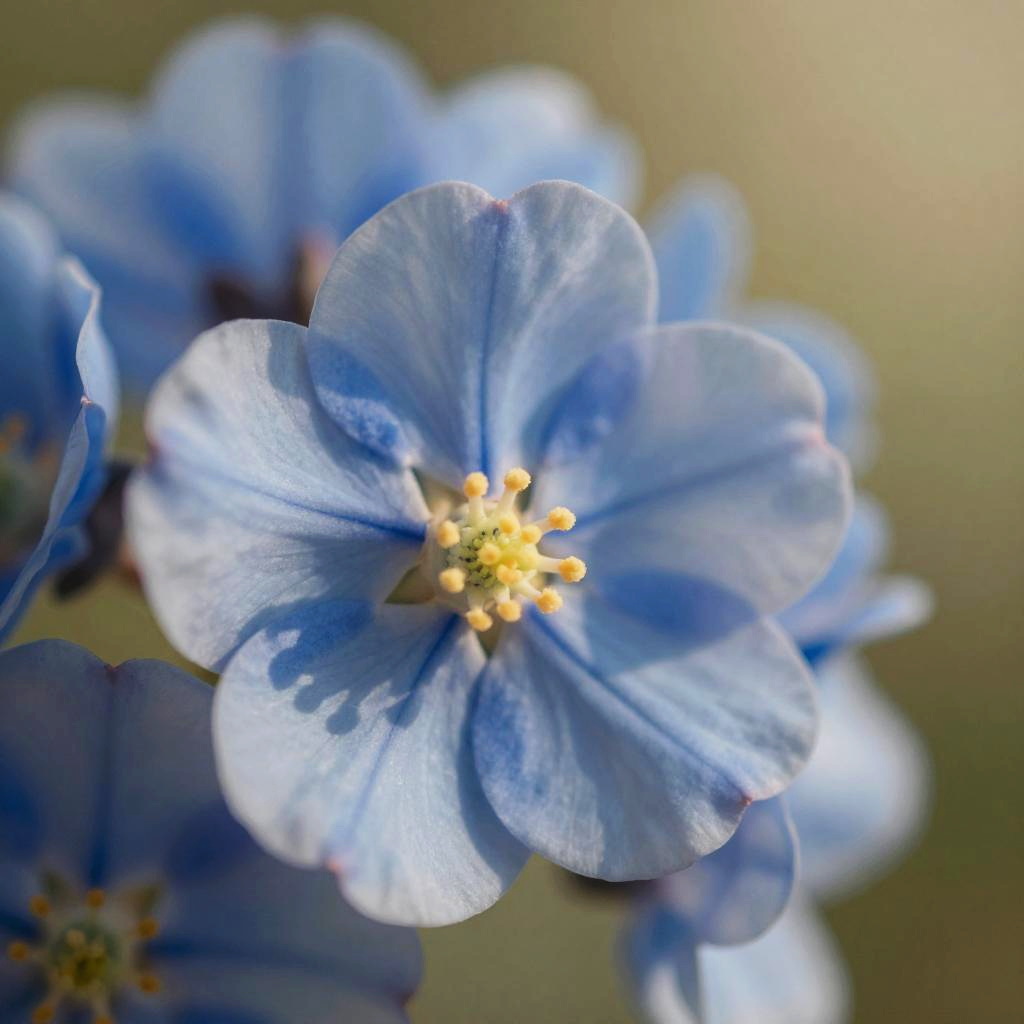 This is a close-up photograph of a blue forget-me-not flower. The central flower is in sharp focus, displaying delicate, light blue petals with subtle veining and a slightly translucent texture. The yellow stamens with tiny pollen grains are prominently visible at the center. The background is softly blurred with a gradient of green and beige, emphasizing the flower. Other blue forget-me-nots are partially visible in the background, creating a sense of depth. The sunlight gently illuminates the petals, highlighting their gentle curves and soft texture. The overall composition is bright and fresh, capturing the delicate beauty of the flower.