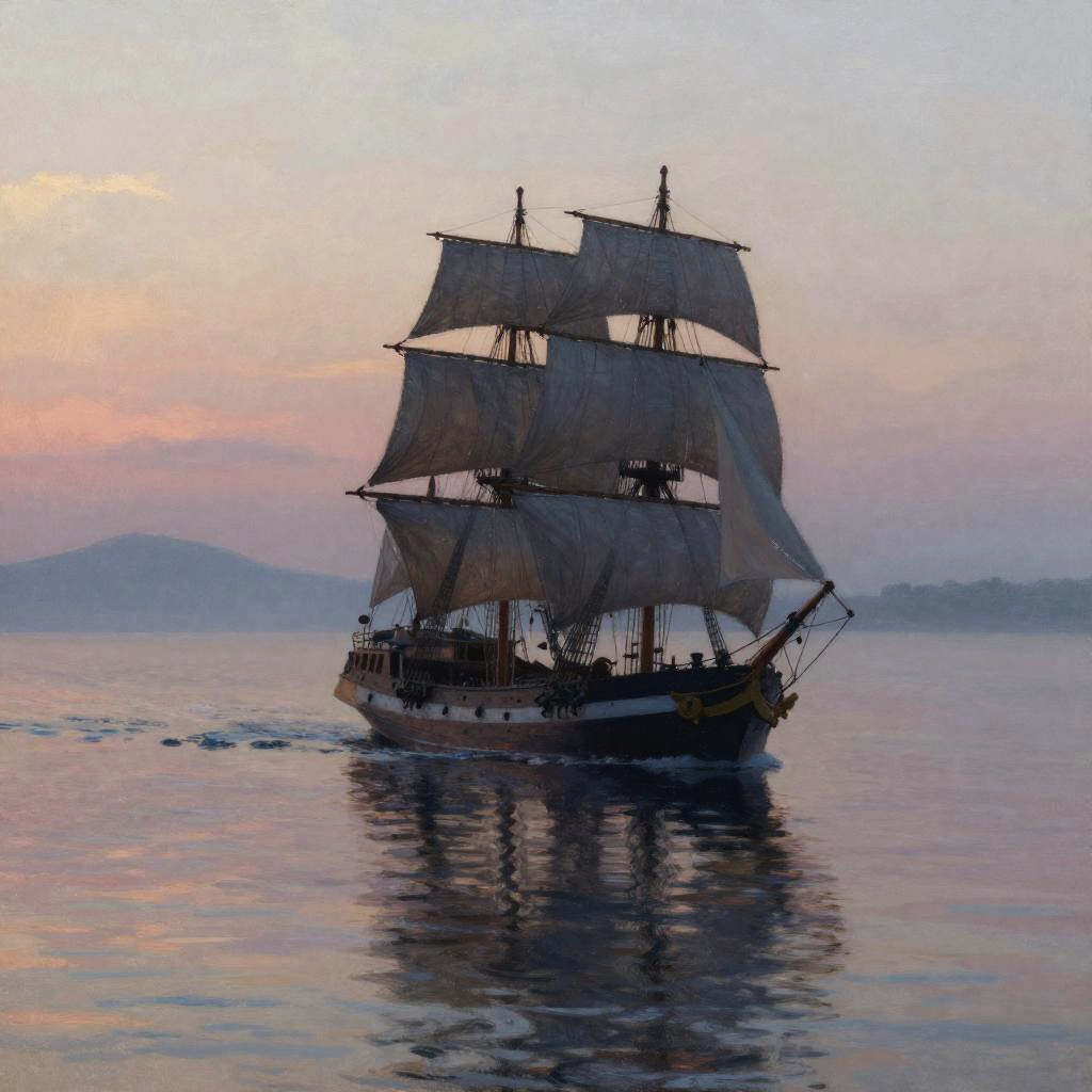 Artistic portrayal of goingmary sailing ship at dawn, calm sea reflecting pastel sky hues, subtle fog rolling over water, the ship's silhouette with billowing sails casting long shadows, peaceful mood, fine brushstroke style, detailed maritime elements