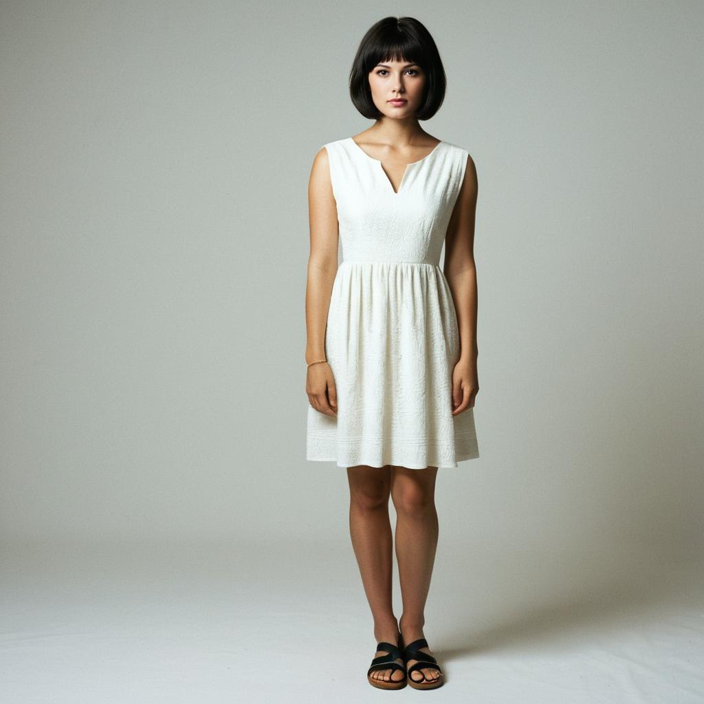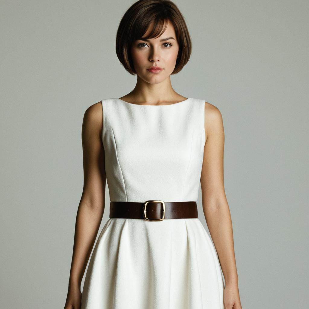 Famous female film character,1girl, solo, realistic, dress, belt, short hair, brown hair, brown eyes, looking at viewer, arms at sides, lips, standing, photorealistic, white dress, closed mouth