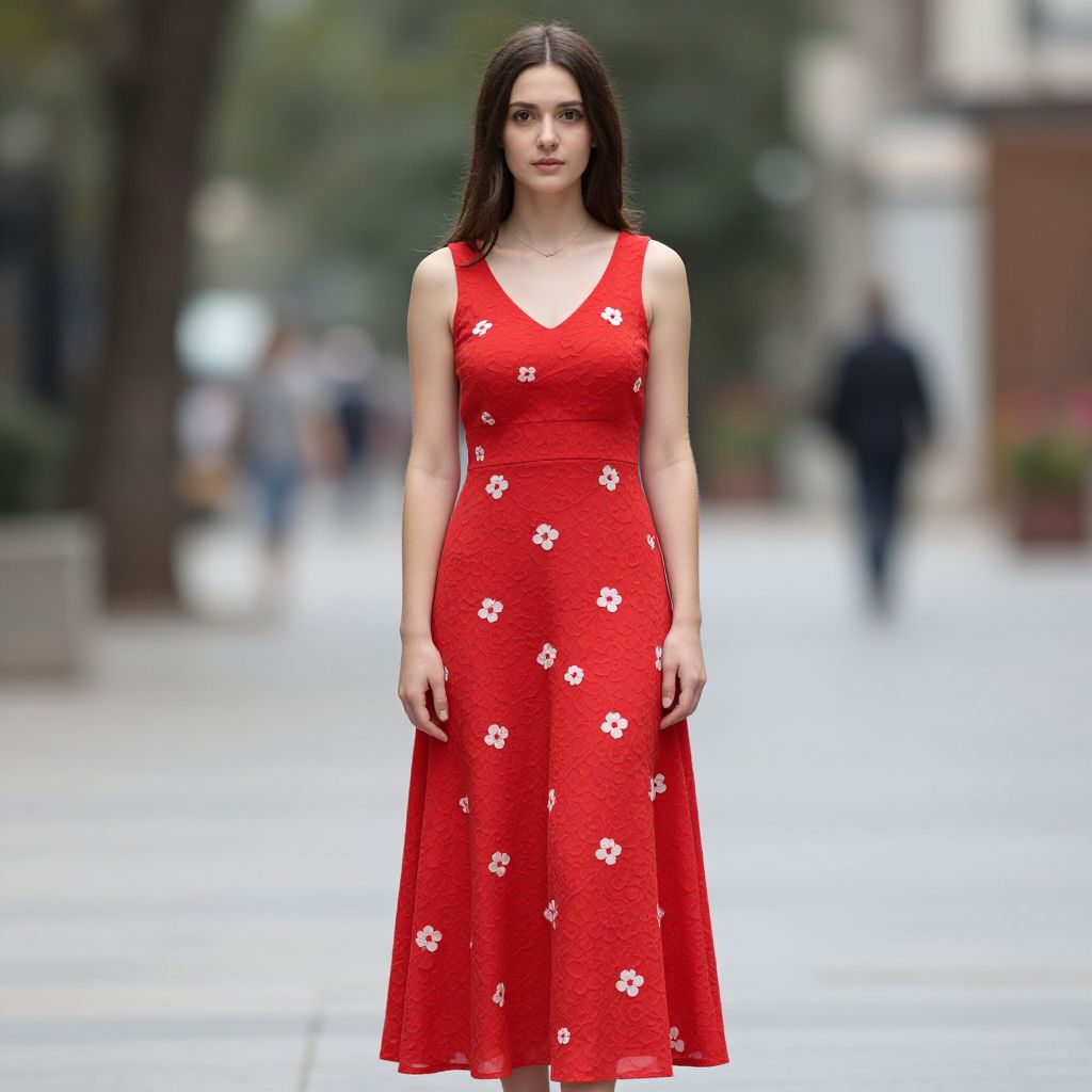"full length dress party wear, 1girl, solo, dress, red dress, flower, realistic, blurry, blurry background, looking at viewer, standing, outdoors, sleeveless, brown hair Realistic photo of casual sexy person with pretty face"