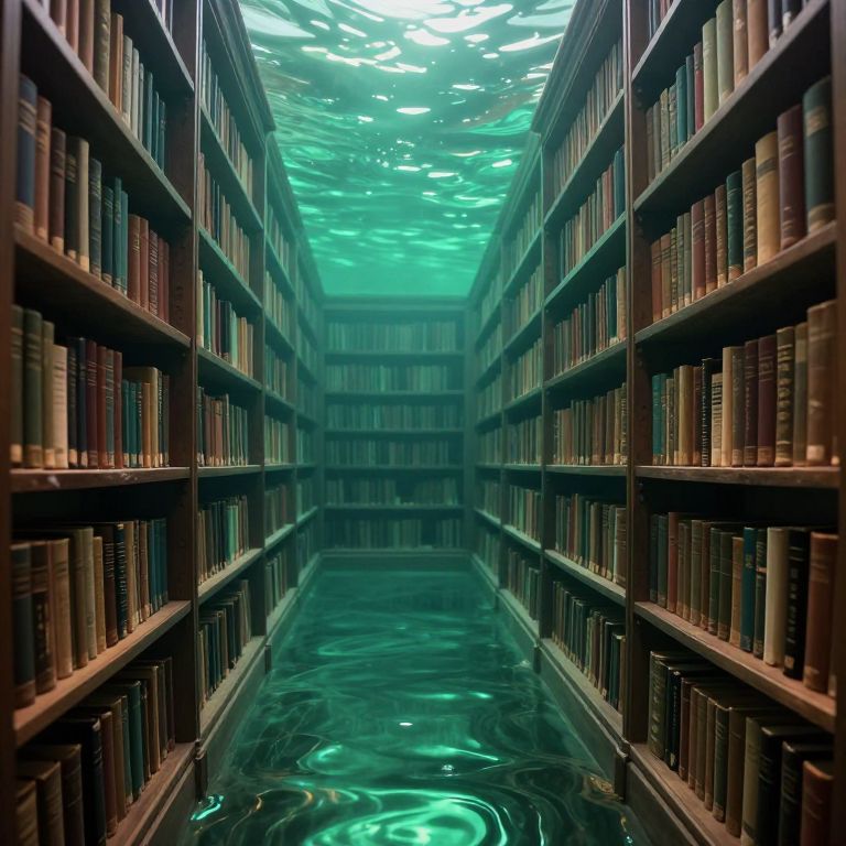 A serene library aisle is transformed into a mystical underwater realm, where ancient bookshelves stand eternally preserved beneath a shimmering sea of emerald-green water, reflecting the timeless allure of knowledge.