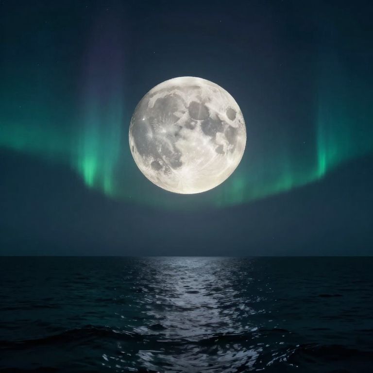 Photograph of a luminous full moon centered in a dark, starless night sky, surrounded by vibrant green aurora lights. The moon's surface is detailed with craters and textures. Below, a calm, dark blue ocean reflects the moon's light, creating a shimmering effect. The horizon is barely visible, blending into the deep night sky. The overall scene is serene and mystical, with the moon and aurora lights being the main focal points.