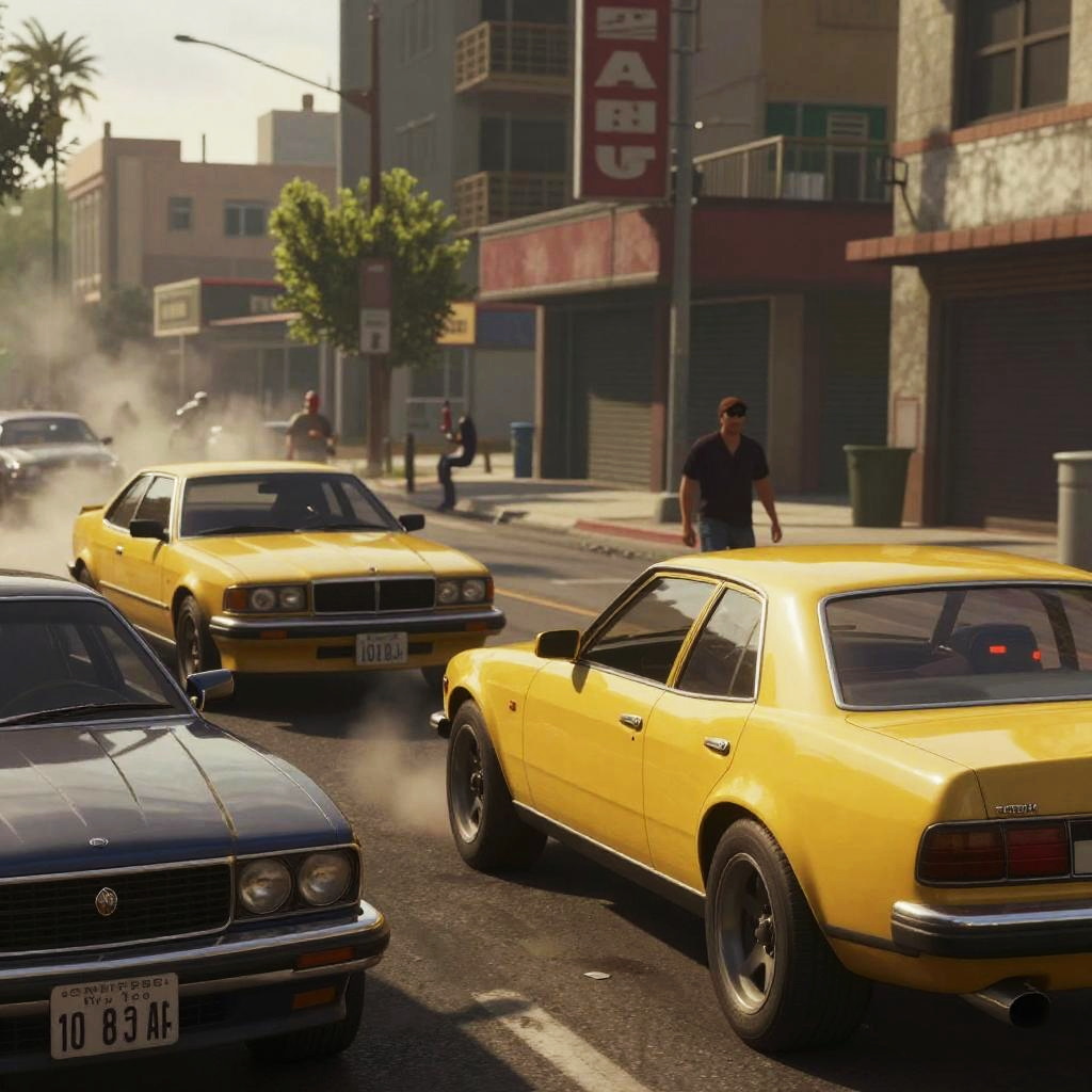 GTA AI art showcasing an intense street chase scene with detailed vehicles, gritty urban environment, and dramatic smoke effects, capturing motion and energy in a hyper-realistic style.