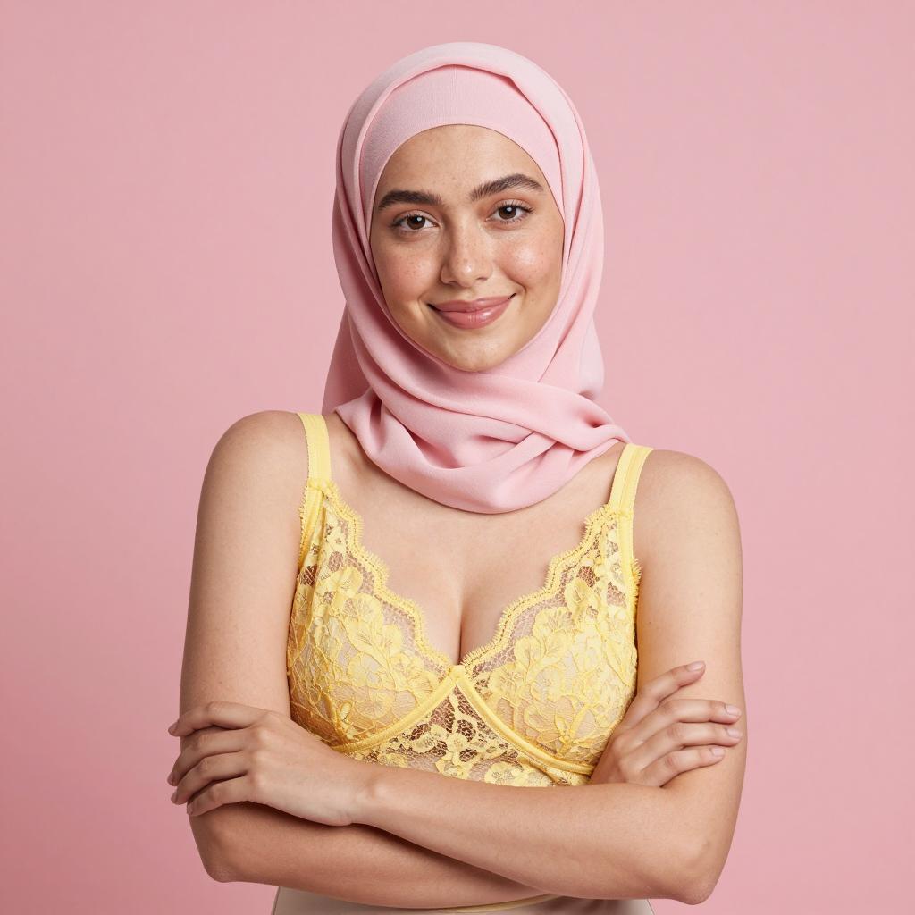 Woman with pale skin and light brown hair wearing a white headscarf, driving a car. She grips the steering wheel with both hands, expression focused. Car interior has red upholstery, rearview mirror, and blurred green background outside. Foggy window.