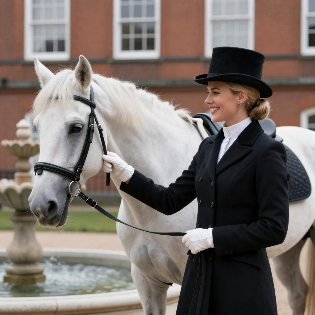 Photograph of a smiling blonde woman in a black top hat, black coat, and white gloves, standing beside a stone fountain, interacting with a white horse wearing a black bridle. Background includes a red brick building with white-framed windows.