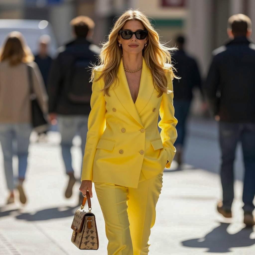 Photograph of a tall, slim woman with blonde hair in a braid, wearing a long yellow coat, pink high heels, and large pink sunglasses. She holds a pink clutch with folded edges in her right hand. She walks confidently on a city street with modern buildings and a glass-covered walkway in the background. Her left leg is exposed, showing her thigh. She has a calm expression. Several people are in the background, slightly blurred.