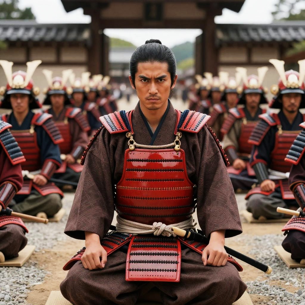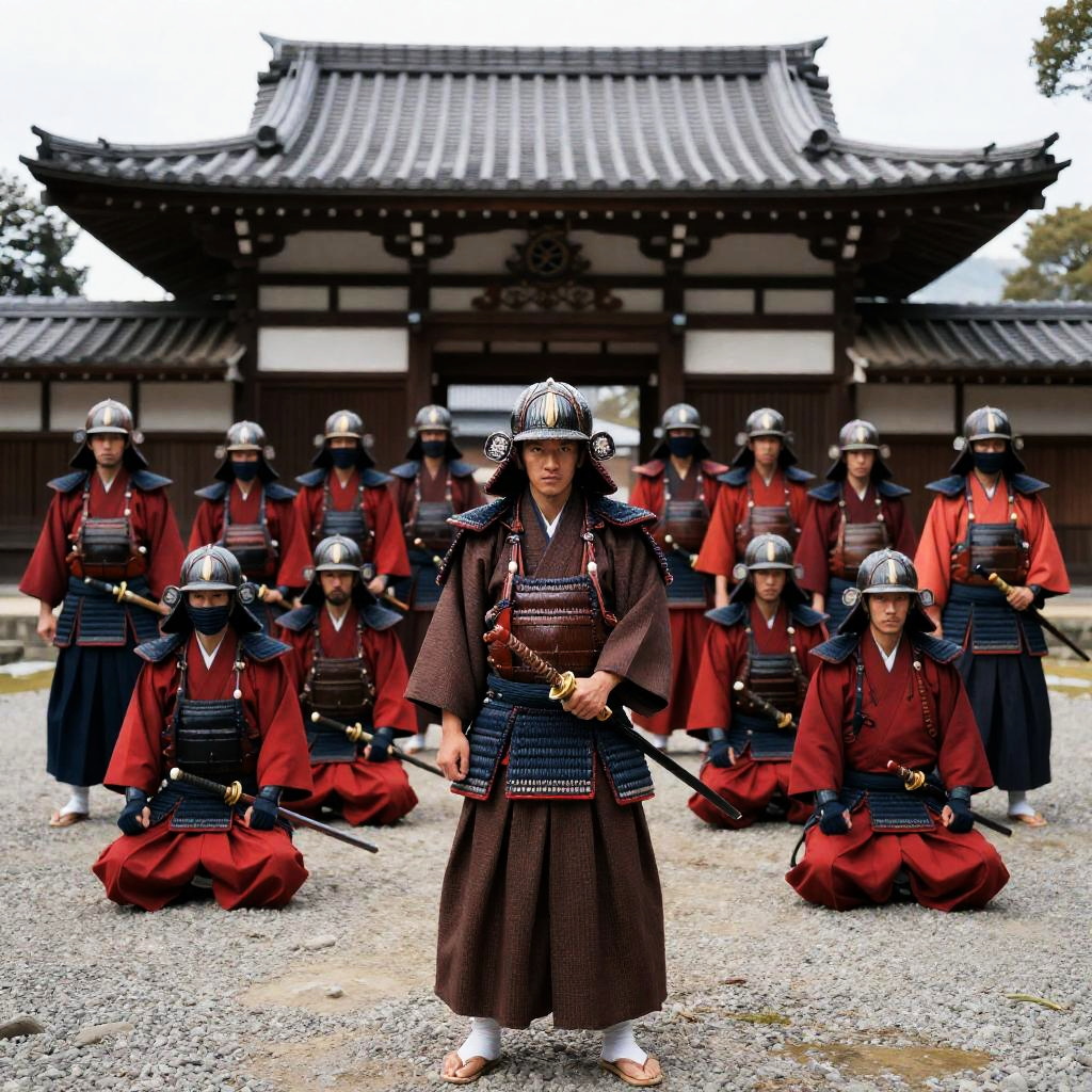 Photograph of a group of 17 samurai in traditional Japanese armor and red robes, kneeling and standing in a gravel courtyard. Central figure in brown kimono holds a sword, flanked by others with determined expressions. Traditional wooden building with curved roof in background. Snow-covered trees on the left. Samurai wear helmets and face masks, with some kneeling and others standing. Gravel ground, samurai swords scattered.