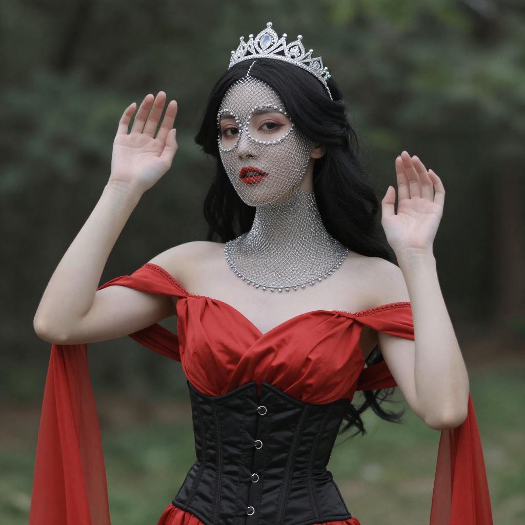 Photograph of a pale-skinned woman with black hair, wearing a silver face and neck mesh, red off-shoulder dress, and black corset. She has red lipstick, a silver crown, and is posing outdoors with hands raised, surrounded by greenery.