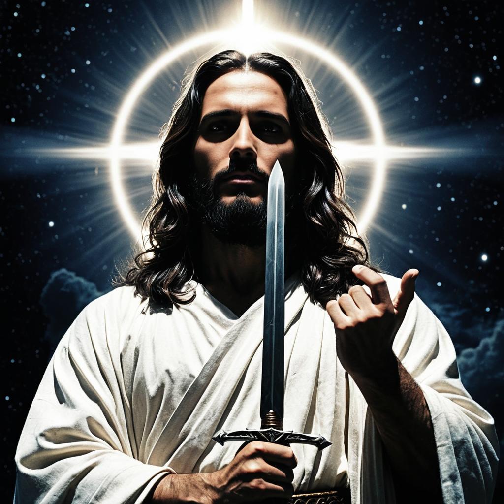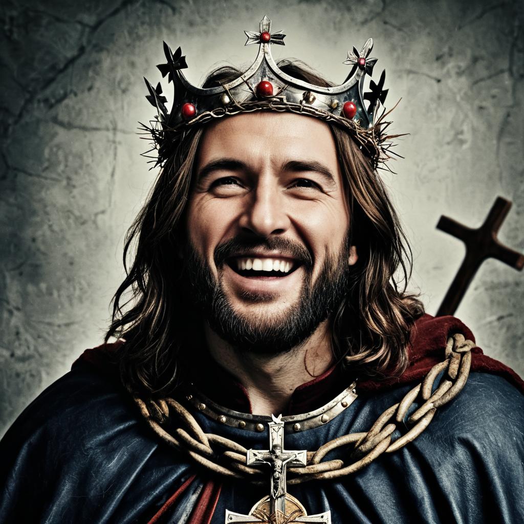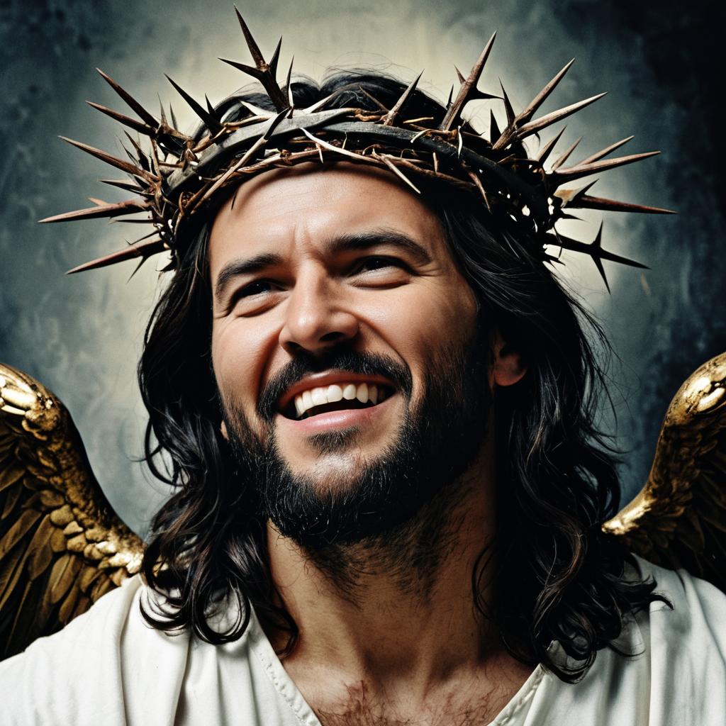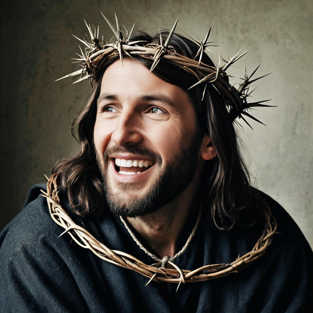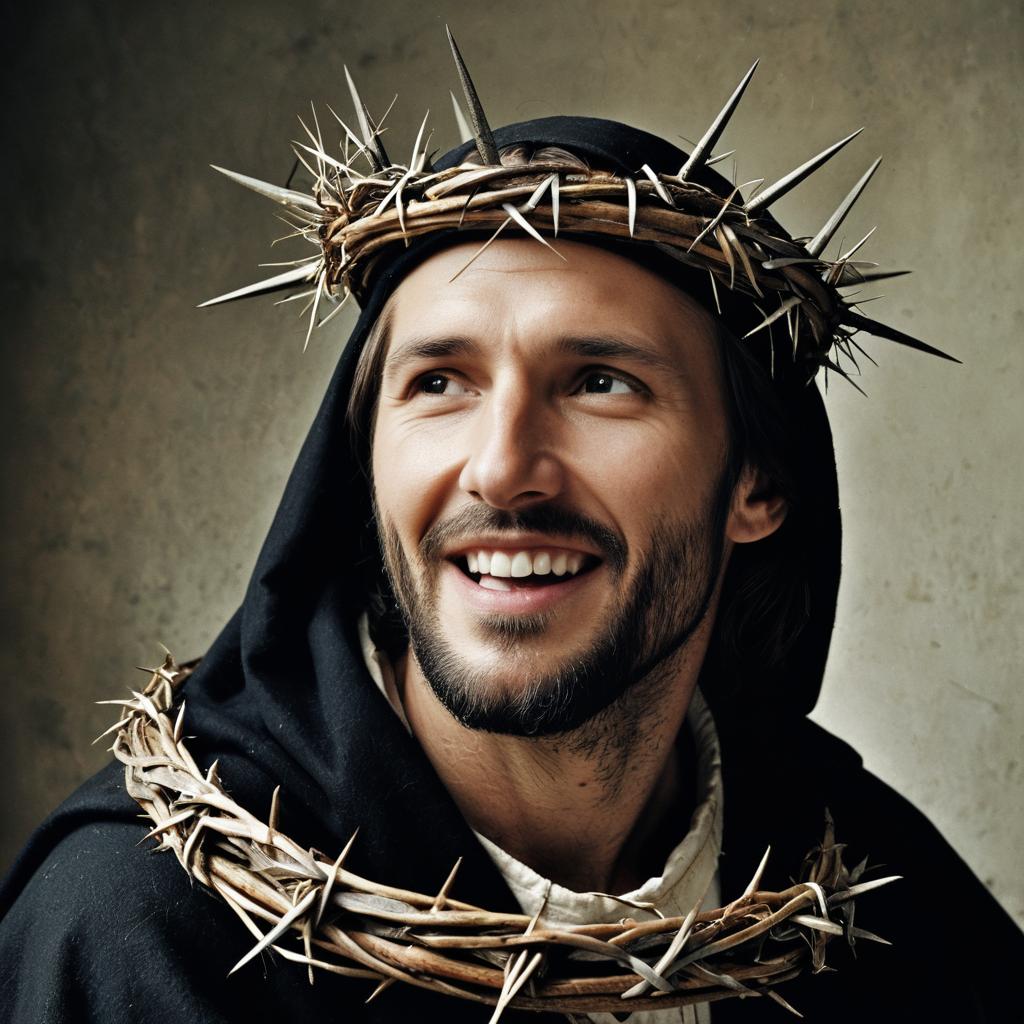 Portrait of a young man with a beard wearing a black cloak and a crown of thorns on his head, symbolizing religious themes related to Jesus Christ. The man is smiling gently and looking slightly to the side against a neutral, textured background.