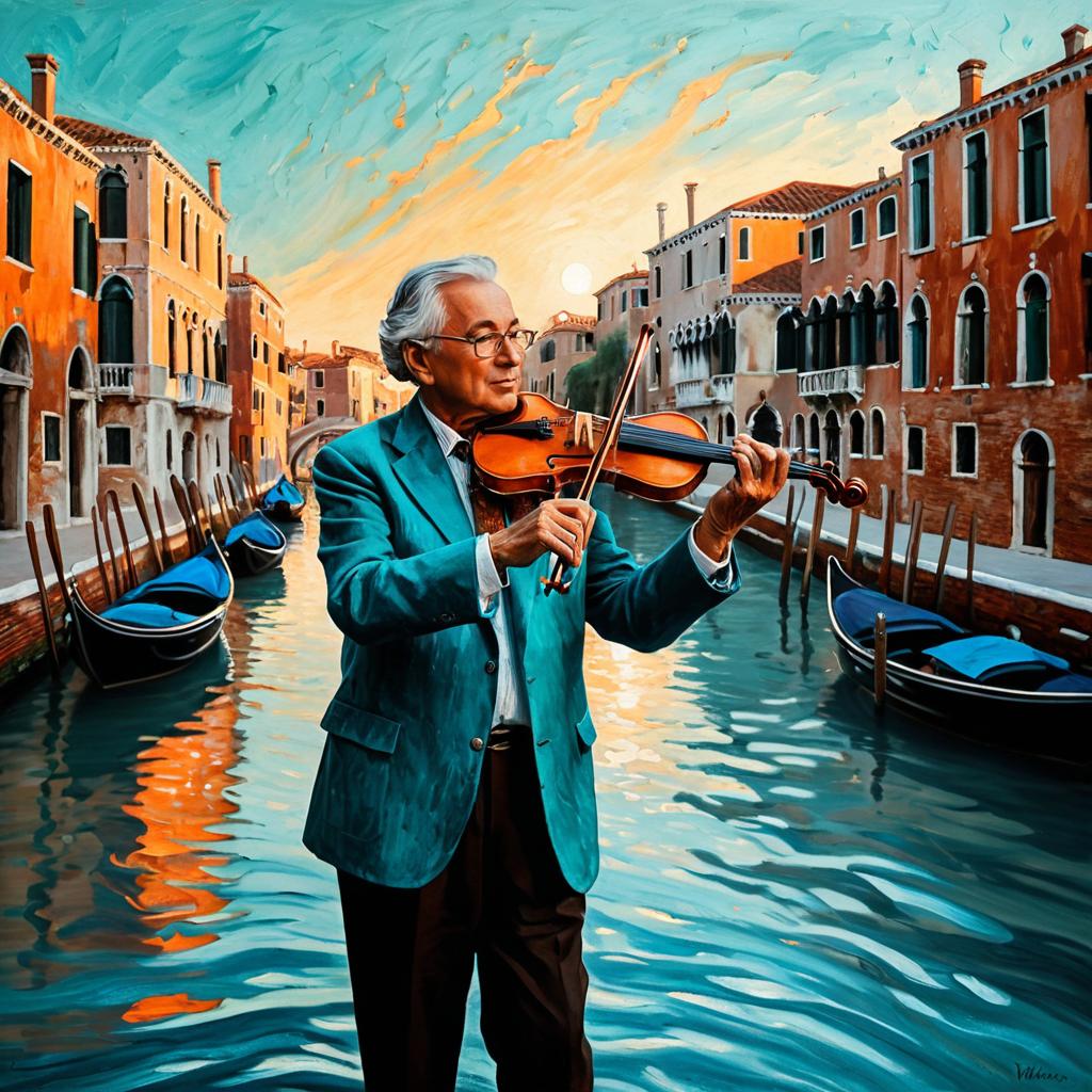 Professional Impressionistic painting of elderly violinist in sunset-lit Venetian canal, swirling turquoise and burnt sienna brushstrokes, oil on hand-stretched canvas, limited edition, Winsor & Newton pigments, glibatree style, dynamic composition, vibrant hues, textured impasto effects.
