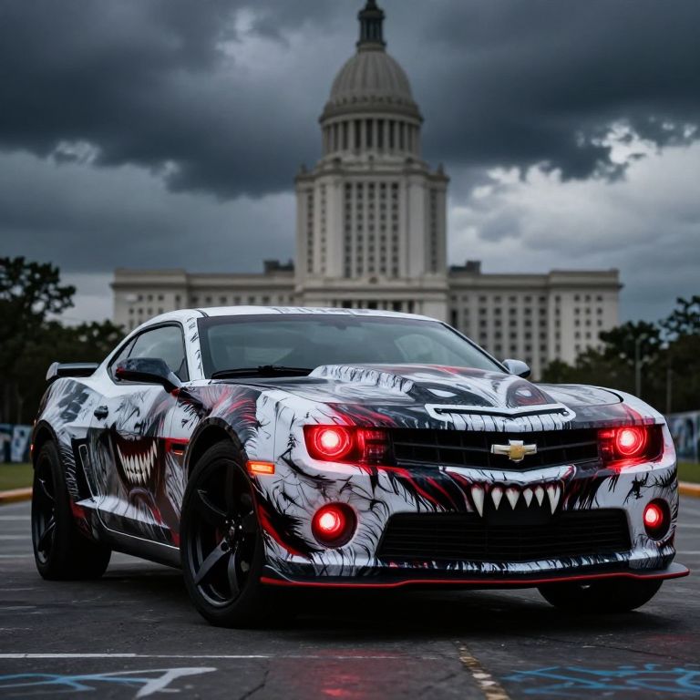 A striking photograph captures a dramatically modified Chevrolet Camaro parked on a paved surface, with a striking backdrop of a historic government building looming in the distance under a dark and stormy sky, The car boasts a highly detailed and menacing wrap design, featuring a large, open-mouthed monster face with sharp teeth on the front, creating an aggressive and predatory vibe, The design, which resembles scales or feathers, extends across the hood and sides of the vehicle, enhancing the fierce aesthetic, The color scheme of the car is predominantly white, with black and red accents adding to its sinister appearance, The red glowing headlights and side markers cast an eerie, almost demonic glow, further emphasizing the monster theme, The cinematic image exudes power and intimidation, amplified by the ominous weather and the grand architecture, The, graffiti, cinematic, vibrant