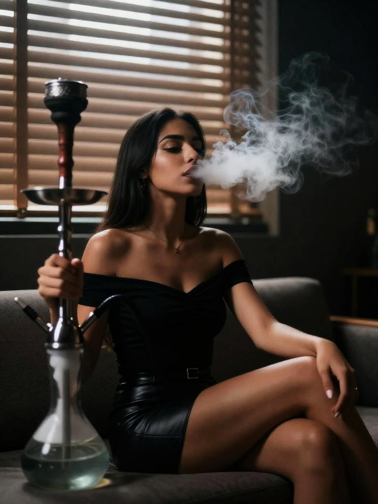 Woman smoking shisha, moody night interior, dark-haired woman with long straight hair and olive skin sitting on a low couch, relaxed posture with one arm resting on her knee, dense plume of smoke obscuring part of her face, holding a sleek vape-style shisha device in one hand, wearing off-shoulder black top and leather skirt, dramatic studio-style room with venetian blinds with slivers of light cutting through the room, strong contrast lighting, cinematic nightlife portrait