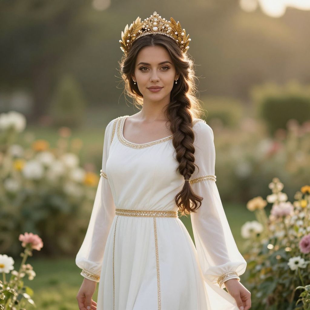 A beautiful woman with long, flowing hair styled in intricate braids, wearing a elegant white dress adorned with delicate gold embroidery along the sleeves, hem, and neckline. She wears a matching gold headband that holds her braids in place, giving her a graceful and timeless look. The setting is softly lit, with warm ambient light highlighting her features and the shimmer of the embroidery. She stands confidently in a serene outdoor landscape, with a gentle breeze adding movement to her hair and dress, conveying a sense of calm elegance and natural beauty.