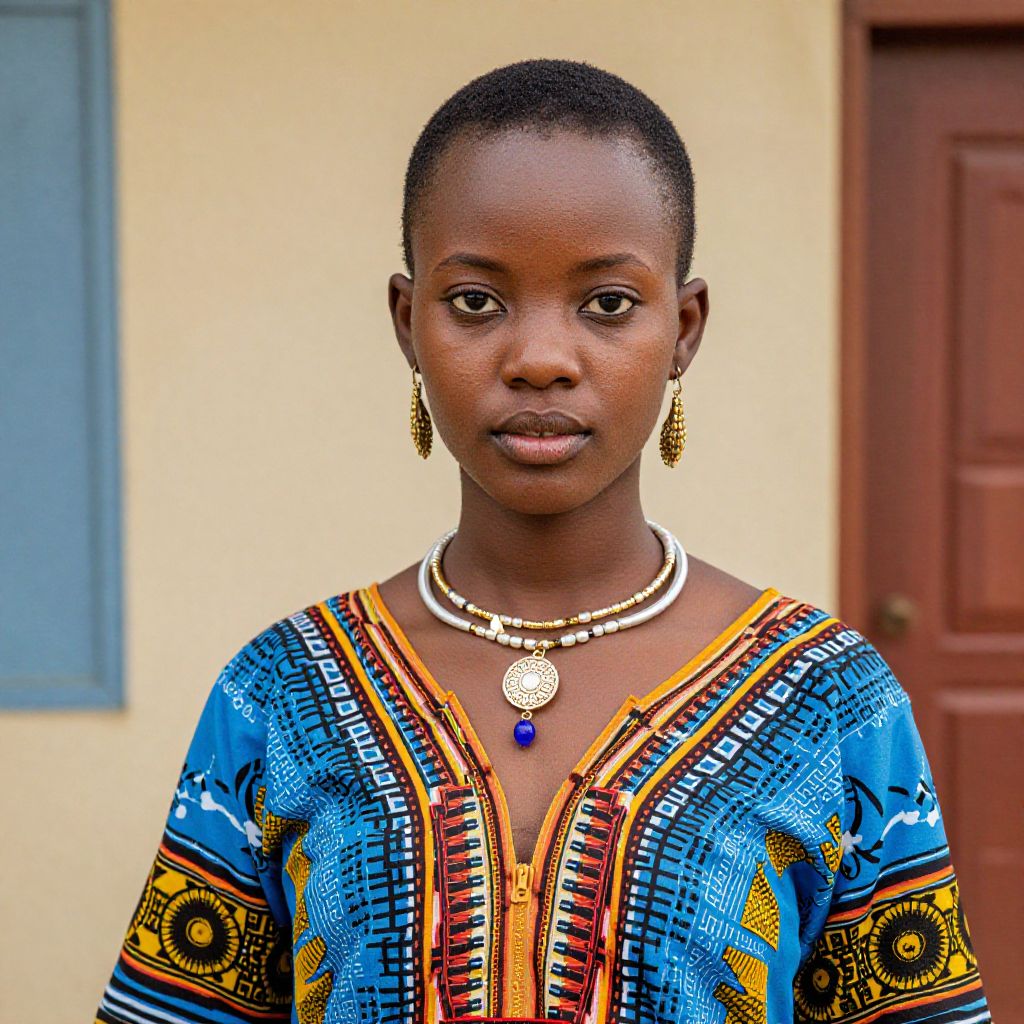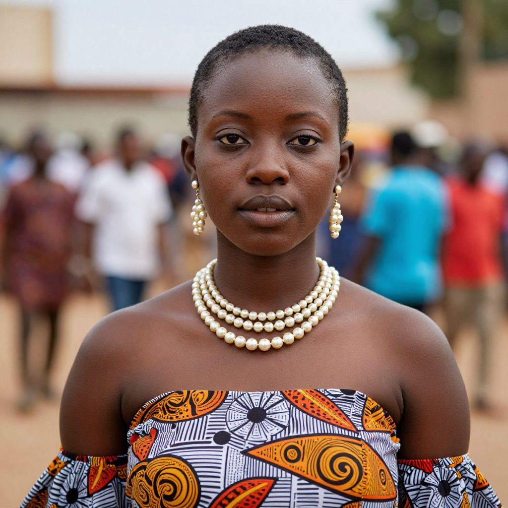 Photograph of a smiling white teenager with braided hair, colorful beaded necklace, and traditional African patterned dress, surrounded by diverse, colorful crowd
