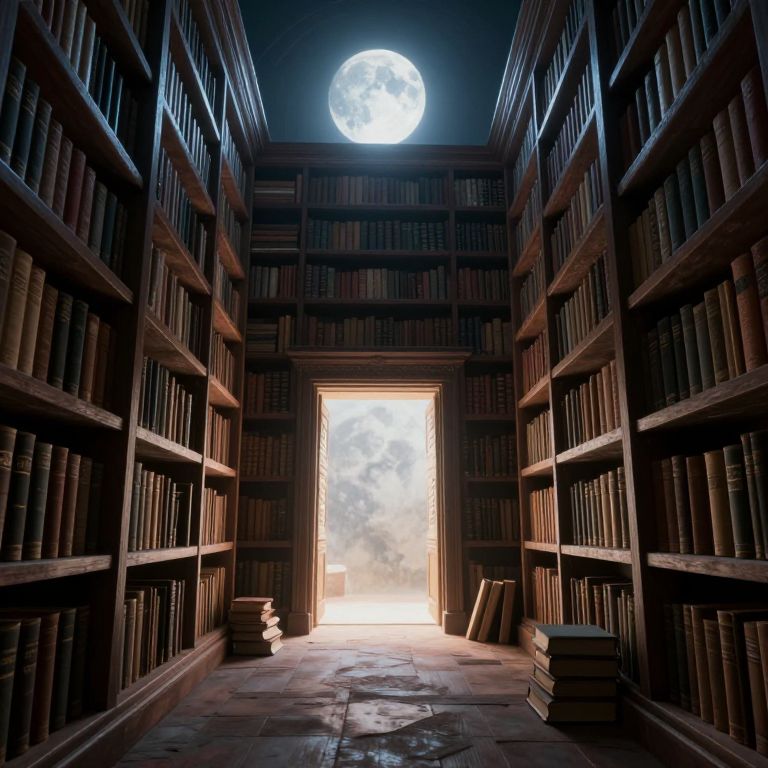 A mystical, computer-generated 3D rendering of an ancient library bathed in ethereal moonlight, where towering shelves of weathered books surround an open, glowing portal, evoking a vintage fantasy atmosphere with a touch of surrealism.