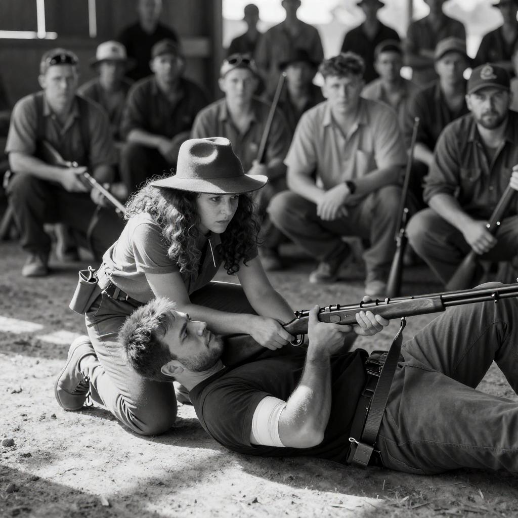 Black-and-white photograph of five people walking through a forest. A man with glasses and a briefcase leads, followed by a woman in a hat and light dress, carrying a bag. Two men with hats and backpacks walk behind. Fallen leaves cover the ground. Two large baskets are carried by the men. The woman looks ahead, the men look down.