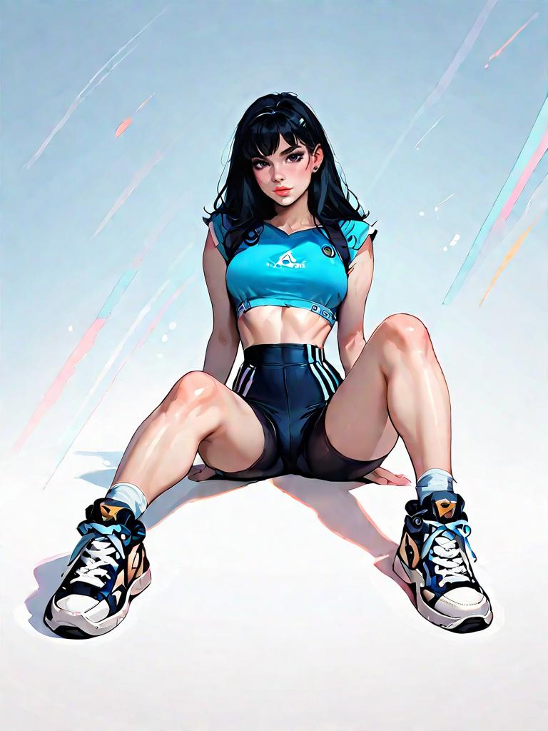 Digital illustration of a young woman with short dark hair wearing a coordinated two-piece athletic outfit. She wears a scoop neck white and black sports bra with thin straps and a racerback design, paired with high-waisted black bike shorts featuring teal and orange side stripes. The woman is depicted with toned muscles and a confident posture against a plain white background with a teal circular accent.