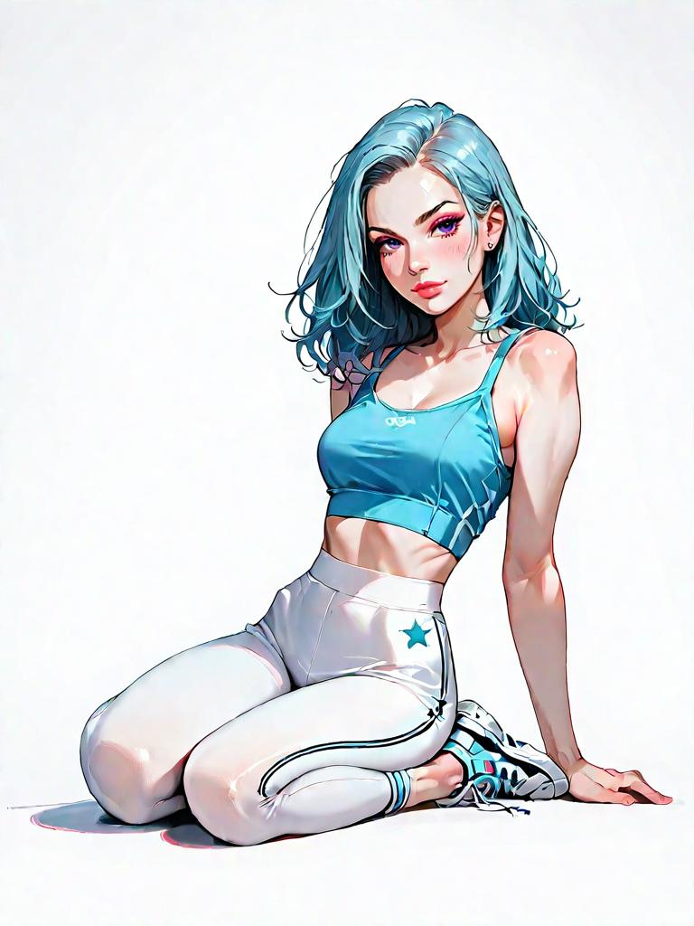 1girl, source_comics, realistic face, full body shot, Woman, athletic wear, coordinated two-piece workout outfit in muted teal, scoop neck sports bra with thin straps, racerback design, high-waisted bike shorts, thigh-length, seamless fabric, studio background.