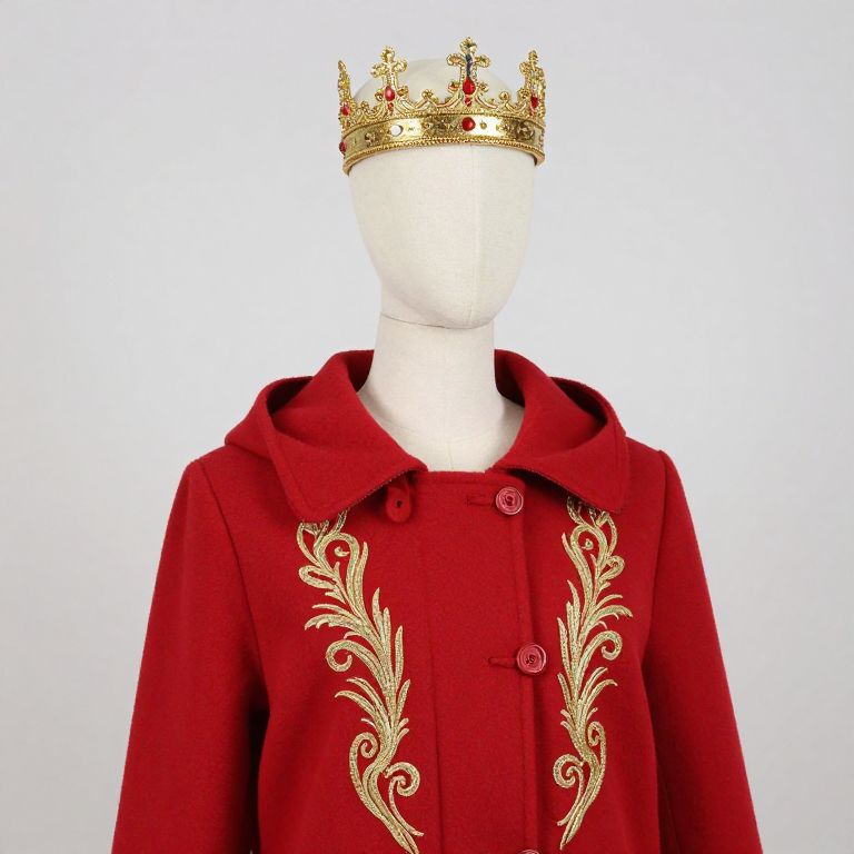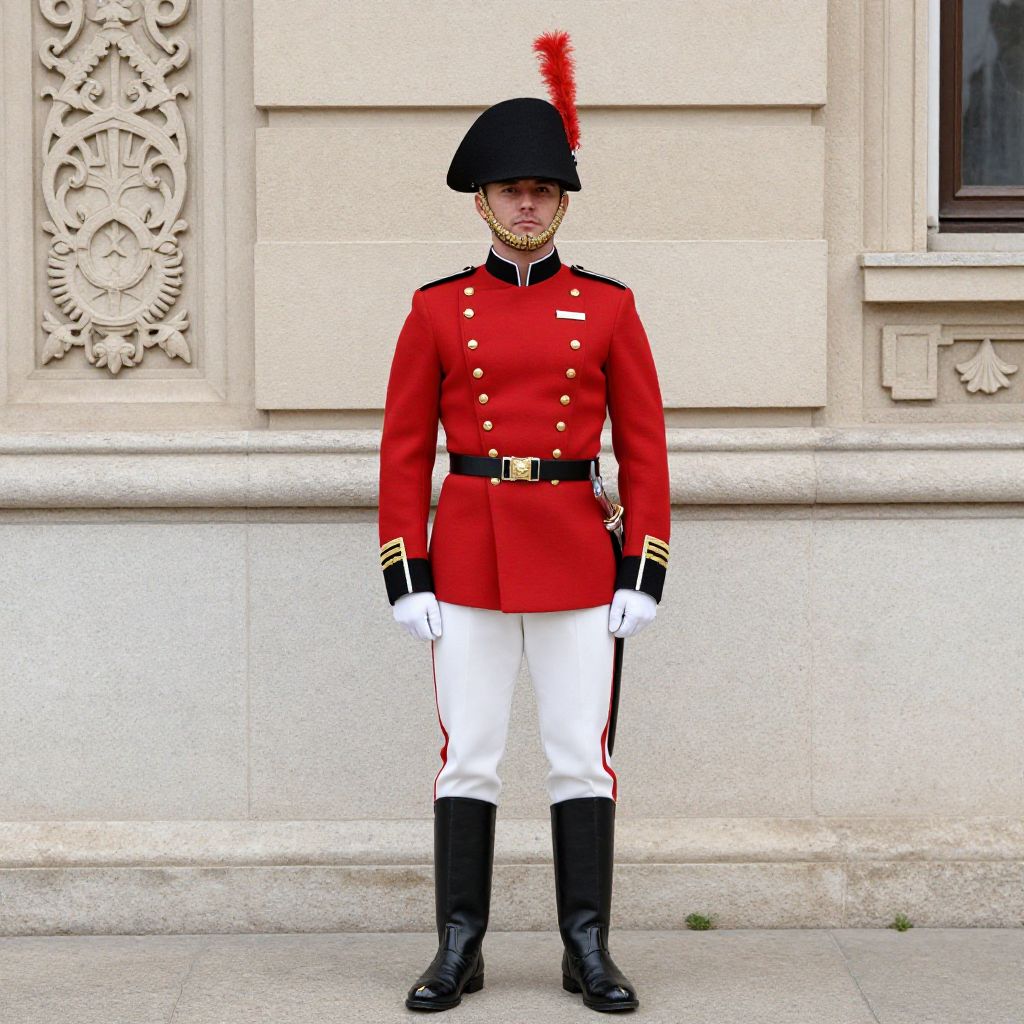 Mannequin wearing a red and green military uniform with gold accents and a black belt.