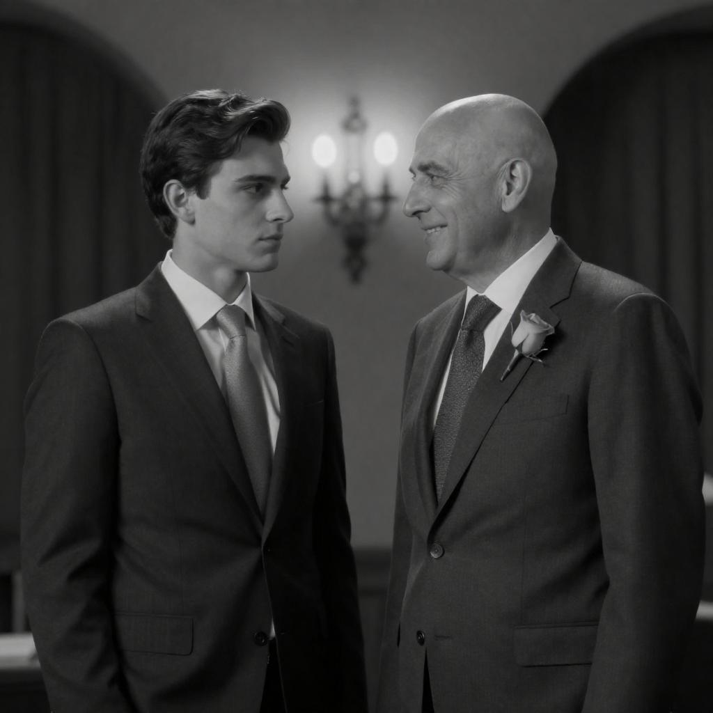 Black-and-white photograph of two men. Young man with short dark hair, clean-shaven, wearing suit and tie, looking slightly to the side. Older man with grey hair, mustache, wearing hat and dark coat, looking intently at the young man. Both men are close together, facing left. Dark, ured background.