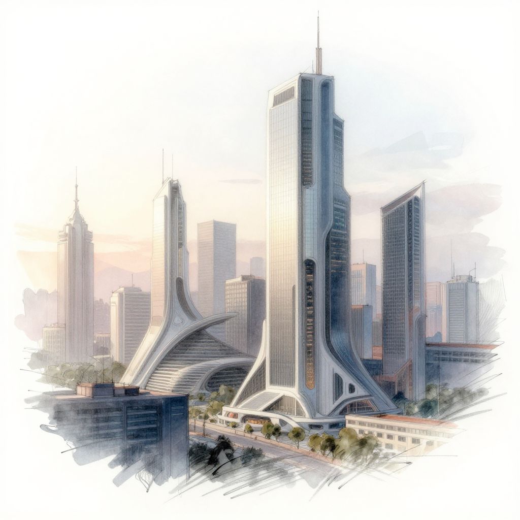 Sketch rendering of a futuristic cityscape at dawn, featuring intricate building designs, soft pencil strokes, and a subtle watercolor wash to enhance depth and atmosphere, emphasizing light and shadow contrasts for a dynamic composition.