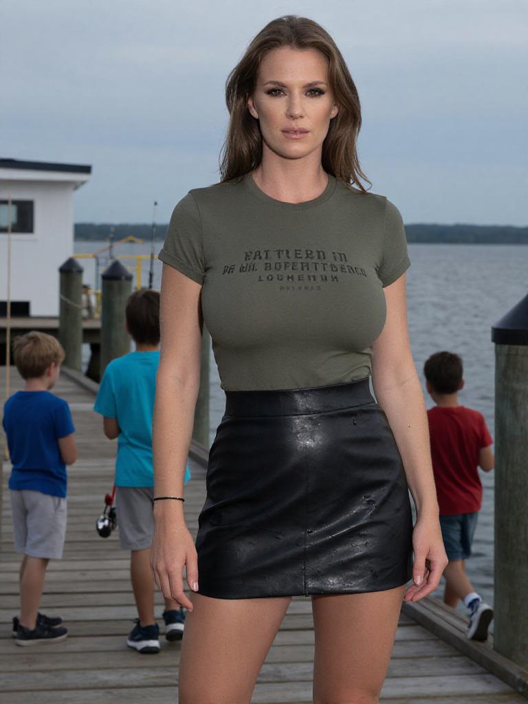 A toned woman in a casual chic style, wearing an olive green fitted T-shirt with text print and a black faux leather mini skirt, stands at a fishing pier with kids. The visual style is reminiscent of Gottfried Helnwein, capturing the scene with a striking, dramatic flair. Minimal accessories include a black slim wristband, complemented by natural makeup and loose hair. Sexy. Pretty face and beаutiful eyes. Big breasts