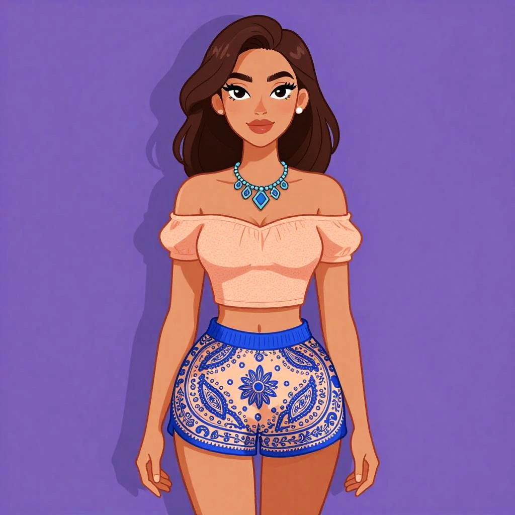 Digital illustration of a dark-haired woman in a white lace crop top and colorful, patterned skirt, wearing gold hoop earrings and bracelets, against a purple