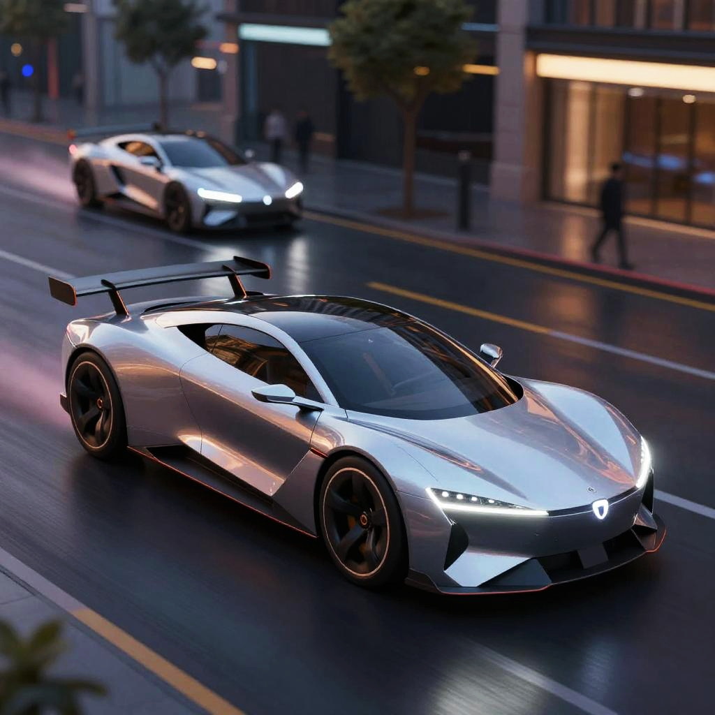 3d model references for vehicle designs, futuristic cars with aerodynamic shapes, neon underglow, reflective surfaces, urban night scene, dynamic and sleek composition