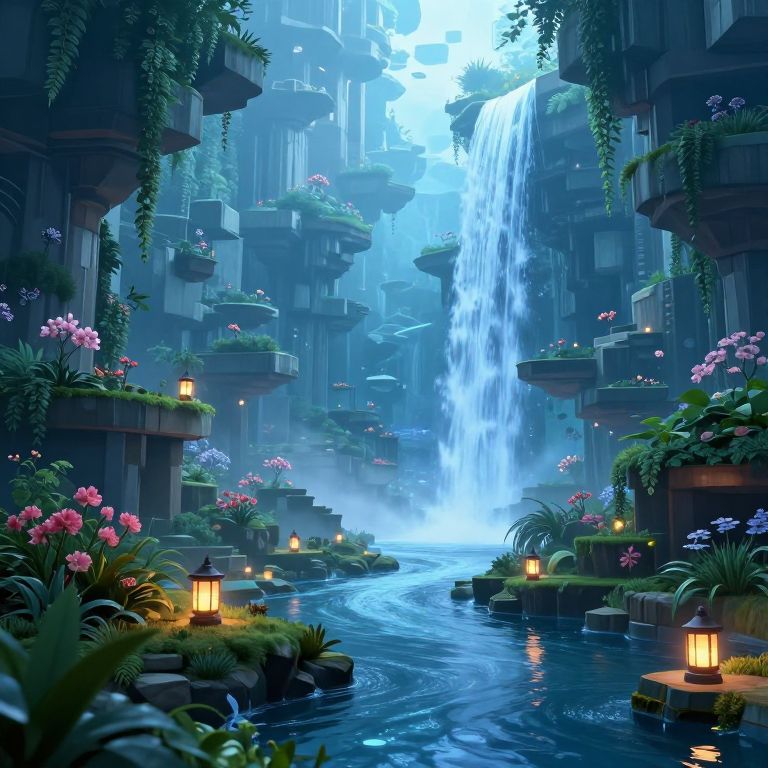 A surreal, blocky landscape of floating terraced platforms and towering structures bathed in ethereal blue light, where gravity-defying waterfalls cascade into a tranquil river, illuminated by flickering lanterns amidst blooming flowers and lush greenery.