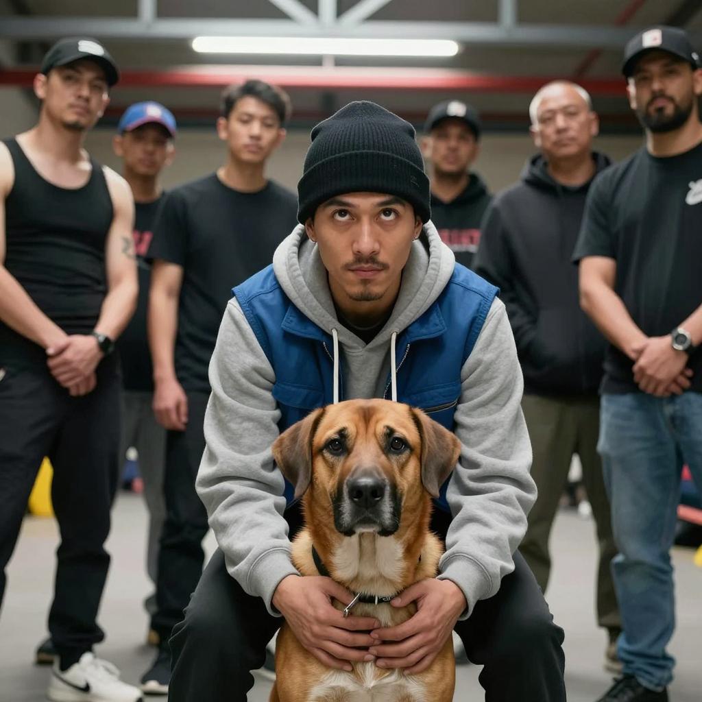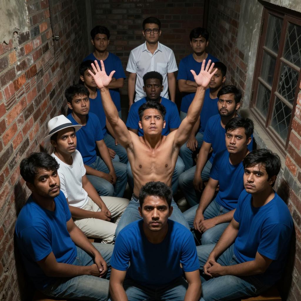 Group of 17 men in a dimly lit, narrow room. Shirtless man in center with arms raised, surrounded by seated men. Most wear blue shirts, some in white. One man in white hat on left. Brick walls, window with patterned glass on right. Men's expressions range from concerned to angry. One man with glasses and white shirt stands at back.