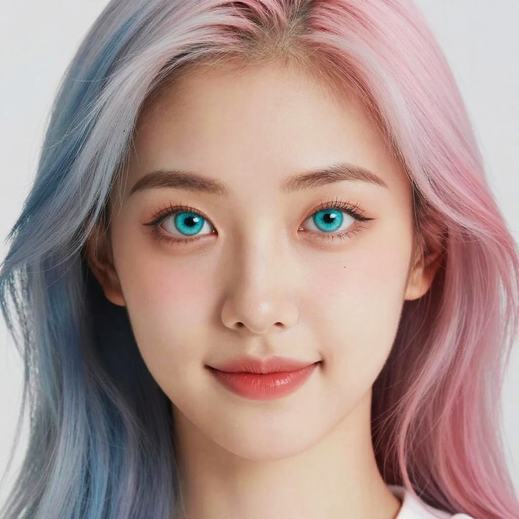 Photorealistic portrait of a young Asian woman with striking blue eyes, pastel pink and blue hair, fair skin, and subtle smile.