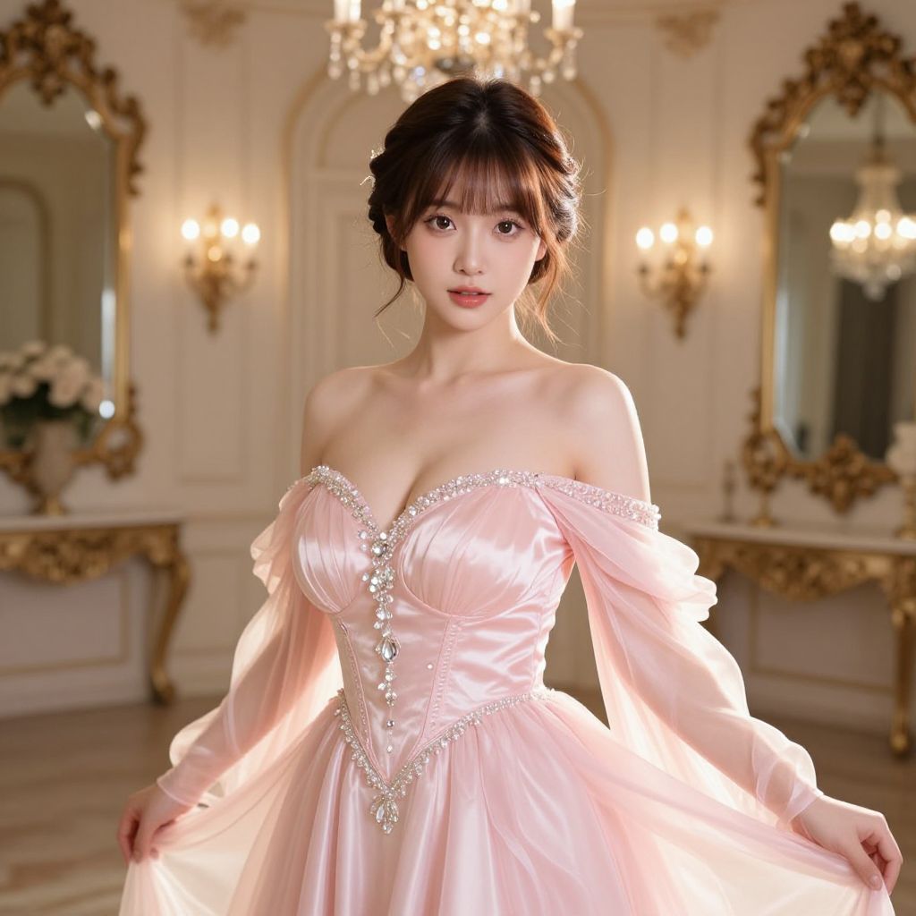Photograph of an attractive East Asian woman with fair skin, dark brown hair in a loose updo with bangs, wearing an off-the-shoulder, pink satin ball gown with sparkling silver embroidery on the bodice and sleeves. She has a slim build with noticeable cleavage. The background features a luxurious, ornate room with cream-colored walls, gold-framed mirrors, and two wall sconces with soft, warm light. A chandelier hangs from the ceiling, and a wooden console table with a floral arrangement is visible to the left. The setting exudes elegance and opulence.