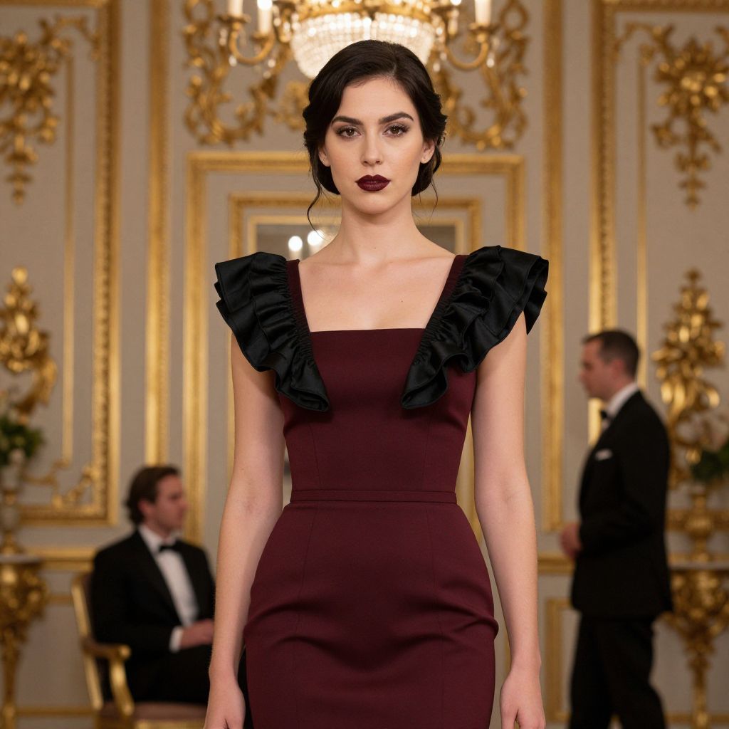 Photograph of a confident woman with fair skin and dark brown hair in an elegant updo, wearing a fitted, maroon dress with black ruffle shoulders. She's standing in an opulent room with ornate gold detailing and a chandelier. Her makeup is dramatic with dark red lipstick. In the blurred background, two people are seated, one in a chair and one standing.