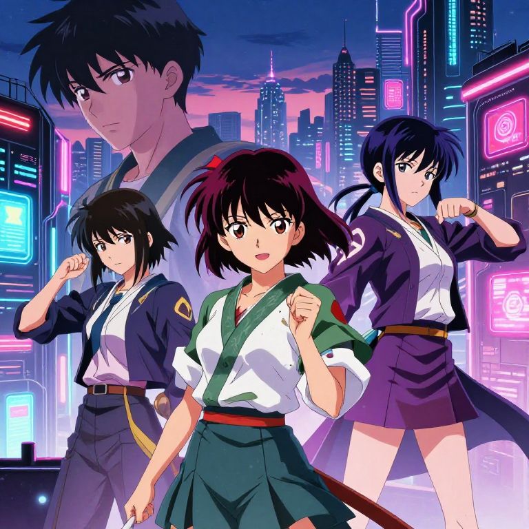 AI art for anime showcasing a futuristic cityscape at dusk, blending vibrant neon colors with traditional anime character designs, detailed expressions, and dynamic poses, in a cyberpunk style with intricate backgrounds and glowing effects.
