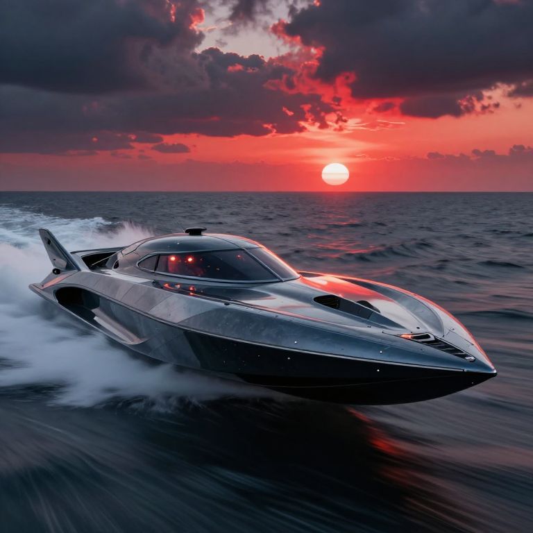 Photorealistic image of a sleek, silver, modern speedboat with a streamlined design, cutting through calm, reflective water at sunset.