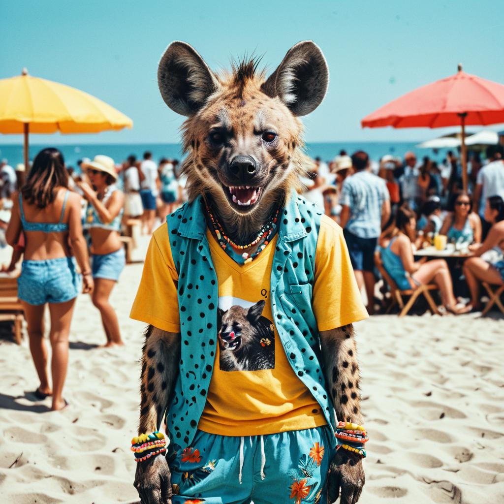 Realistic anthropomorphic hyena character wearing a vibrant summer outfit, including a yellow t-shirt with a hyena print, a teal polka-dot vest, floral shorts, and colorful bracelets. The figure stands on a sandy beach with blurred beach party attendees and colorful umbrellas in the background, under a clear blue sky.