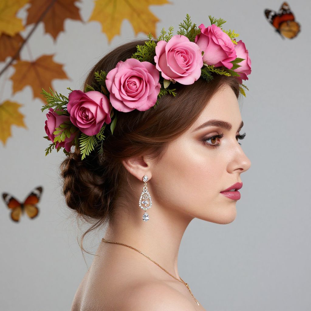 Elegant profile portrait of a woman adorned with a floral crown featuring vibrant pink roses and green foliage, complemented by dangling diamond earrings and a golden necklace, set against a serene background with autumnal leaves and butterflies.