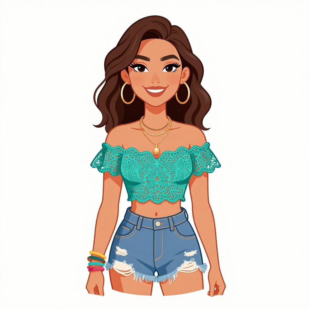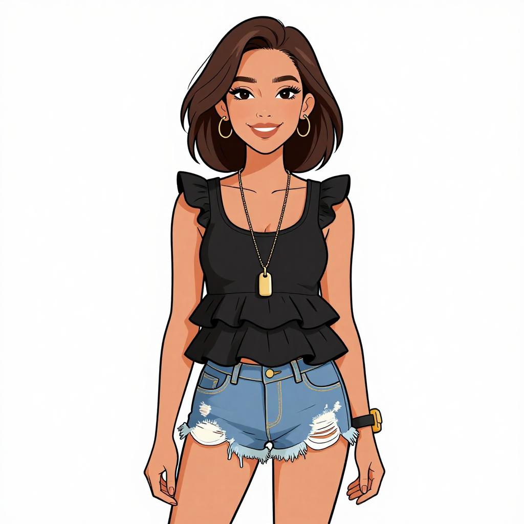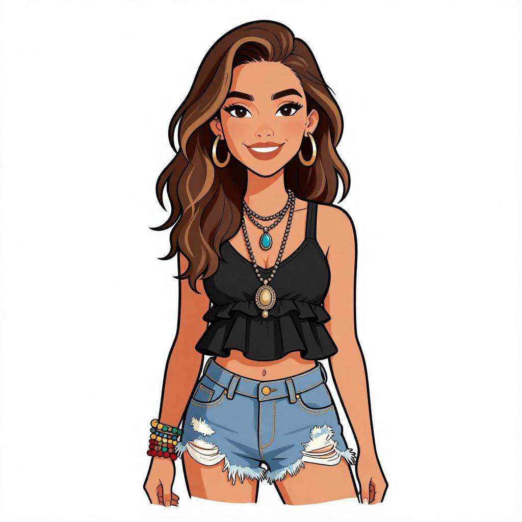 Woman with pretty face and pretty hair. smiling Woman, bohemian, black sleeveless top with tiered ruffles, scoop neckline, distressed denim shorts with frayed hems, layered pendant necklace, boho-inspired bracelet on upper arm, wavy hair with sun-kissed highlights. --sref 1467