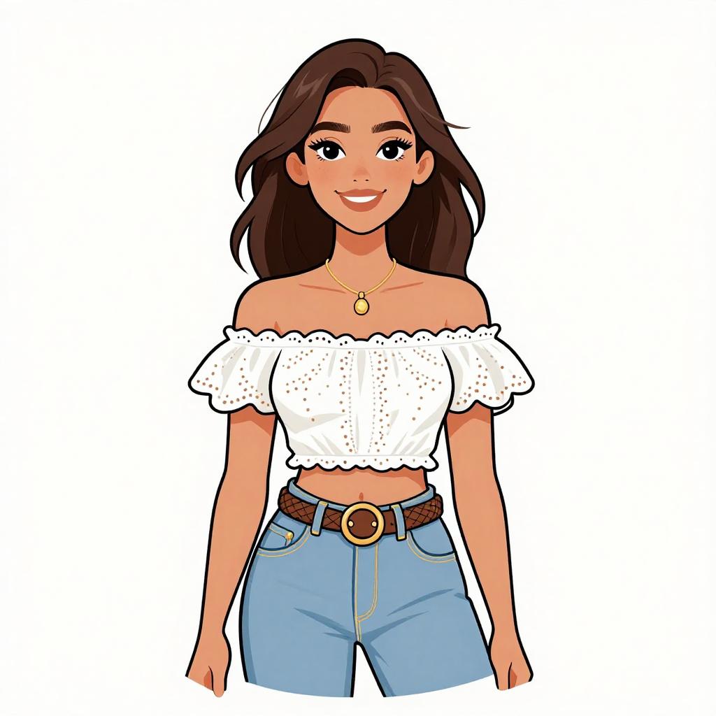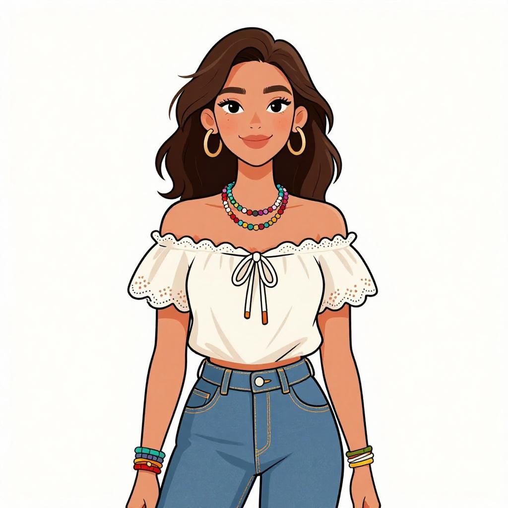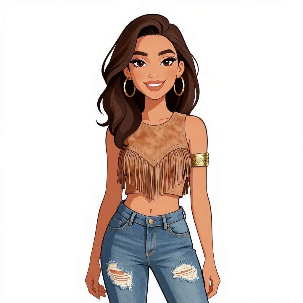 Woman with pretty face and pretty hair. smiling Woman, bohemian, black sleeveless top with tiered ruffles, scoop neckline, distressed denim shorts with frayed hems, layered pendant necklace, boho-inspired bracelet on upper arm, wavy hair with sun-kissed highlights. --sref 1467