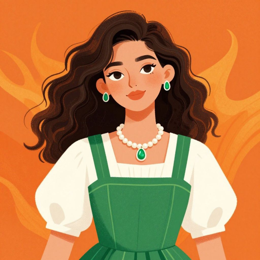 Vibrant illustration portrays a woman with voluminous dark curls, wearing a green pinafore dress over a white blouse, accessorized with a pearl necklace and emerald pendant, set against a fiery orange background.