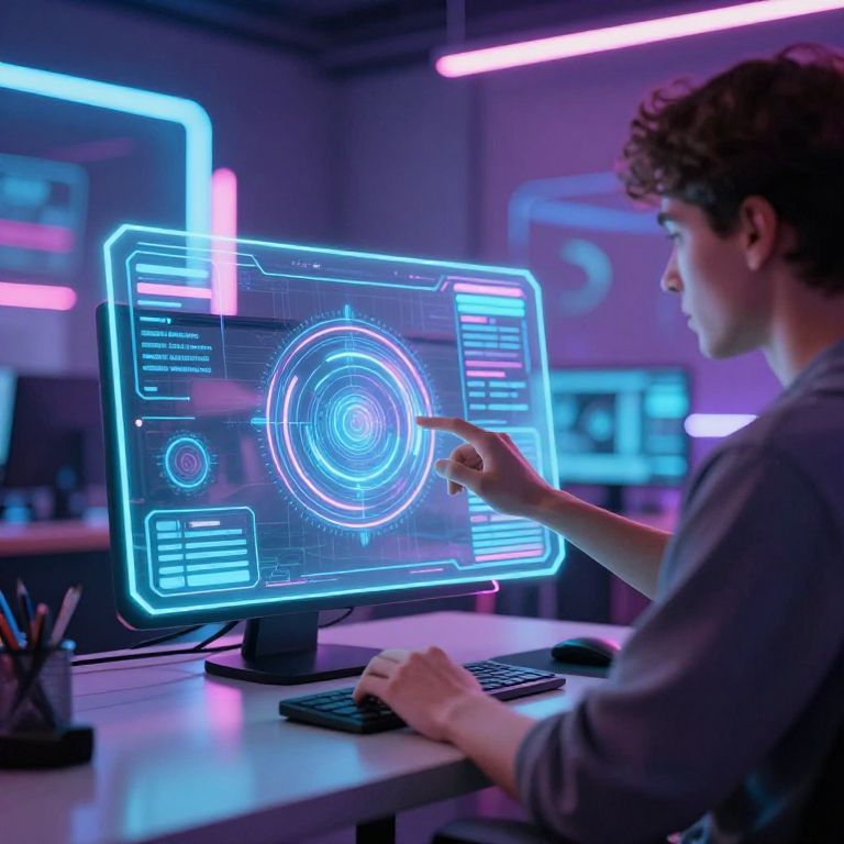Use Dall-E for free demonstration scene, a futuristic digital art studio with a person interacting with a holographic AI interface, vibrant neon colors, sleek modern design, emphasizing accessibility and creativity, immersive technology background, high detail